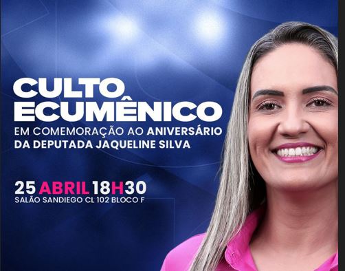 Um culto ecumênico marcará as comemorações pelo aniversário da deputada distrital Jaqueline Silva, celebrado no último dia 21 de abril. O evento está programado para este sábado (25), às 18h30, e será realizado no salão SanDiego, localizado em Santa Maria.