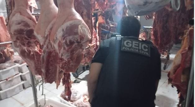Durante a ação, motivada pela denúncia de uma vítima de furto/desvio de carga de carne bovina de sua empresa, a equipe encontrou diversas peças de proteína animal sem notas fiscais idôneas que comprovassem sua origem lícita. A polícia também relatou que as condições de armazenamento eram precárias e inadequadas para o consumo humano: “As carnes estavam armazenadas no chão da câmara fria, enquanto os equipamentos apresentavam ferrugem, danos estruturais e risco de queda das peças penduradas.”